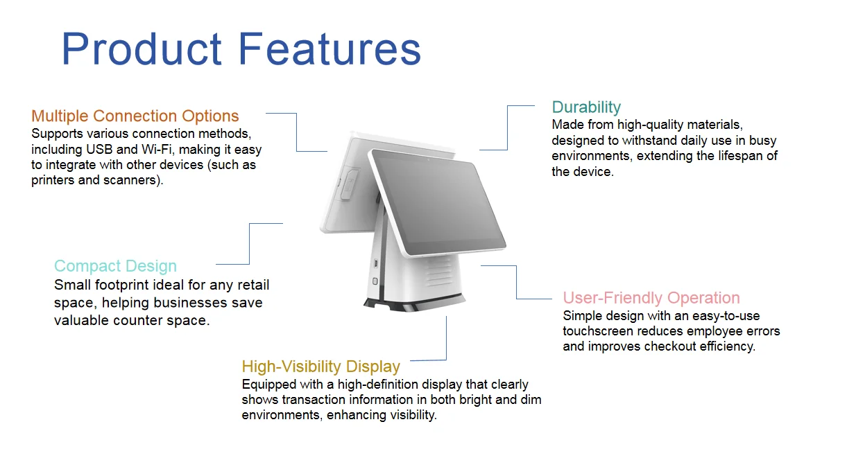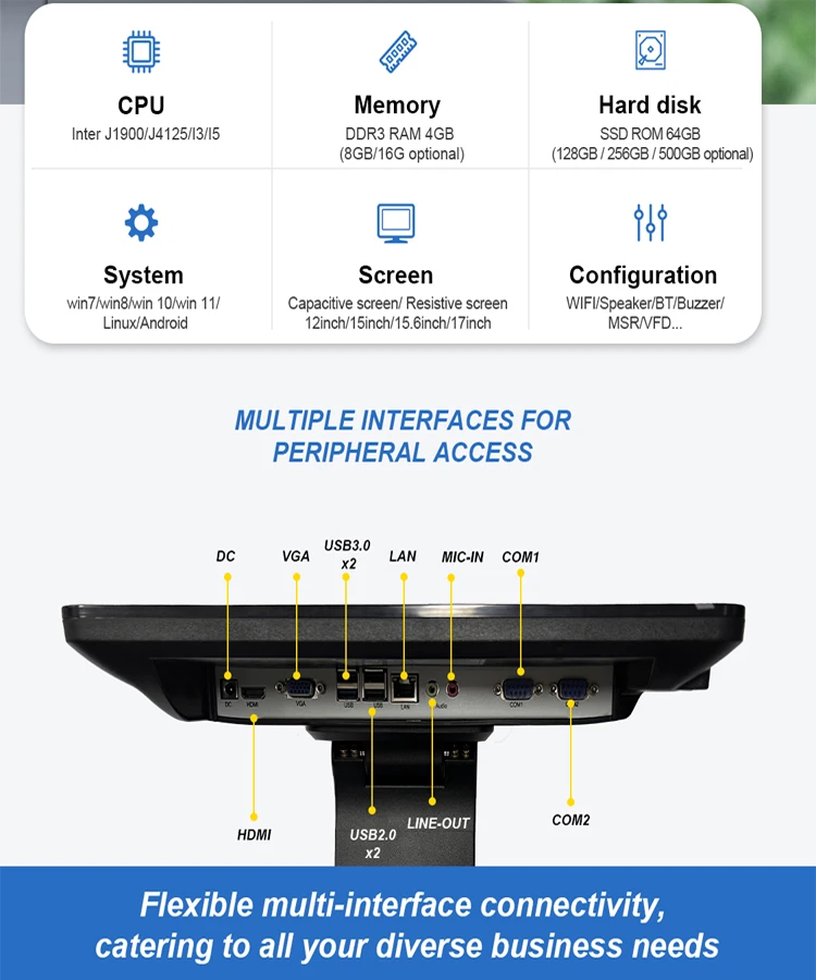 | Optional Peripherals | VFD Customer display,Printer, Cash box, Scanner, WiFi, |