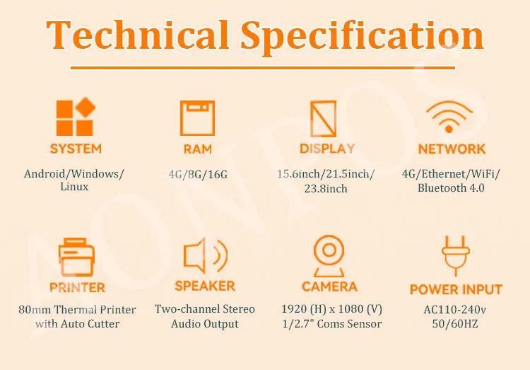 VFD Customer display,Printer, Cash box, Scanner, WiFi |