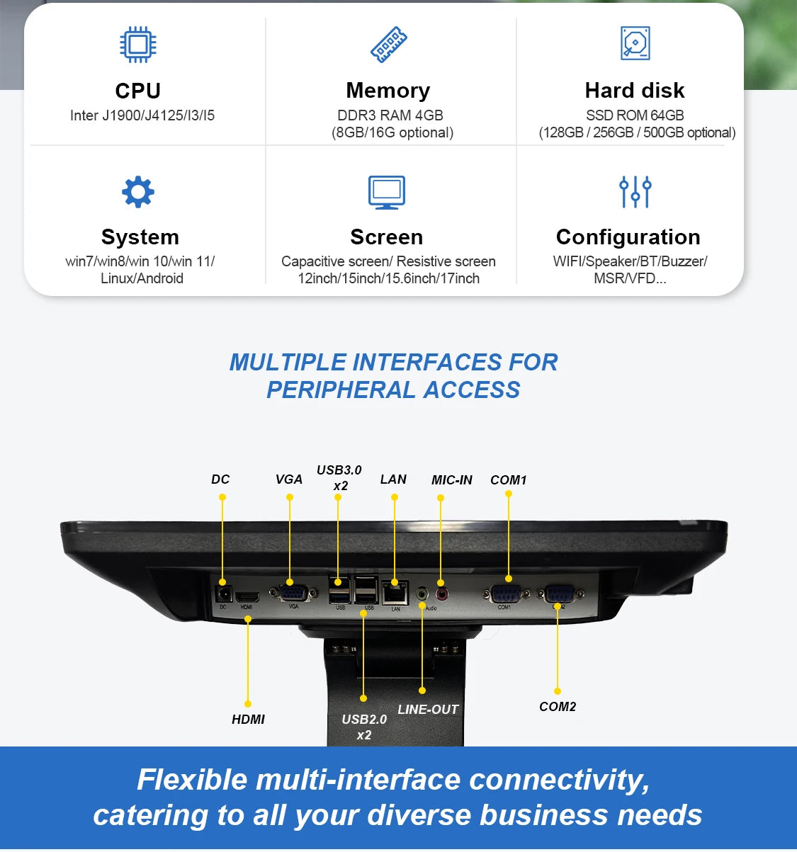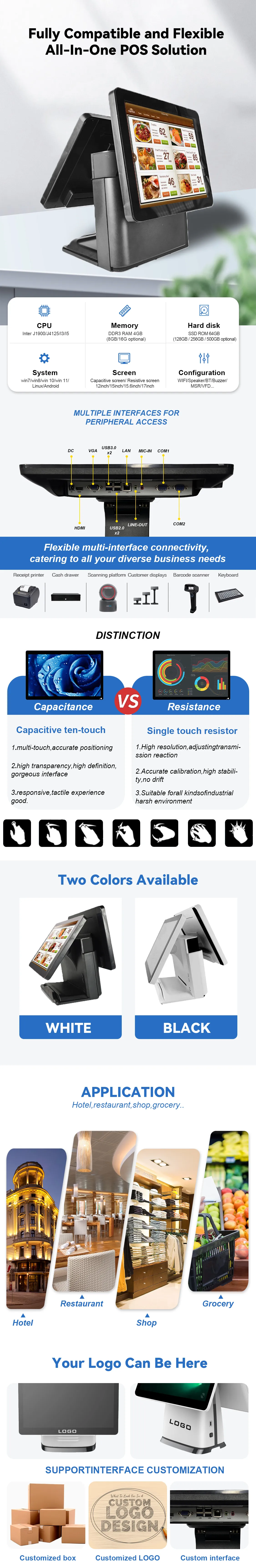 VFD Customer display,Printer, Cash box, Scanner, WiFi, |